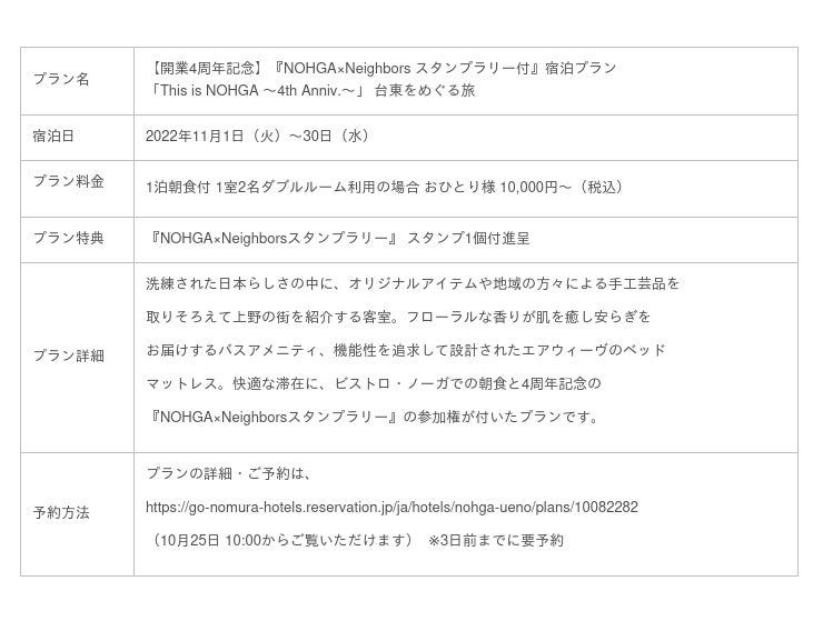 当ホテルは2018年の開業以来、ホテルコンセプト「地域との深いつながりから生まれる素敵な経験」の下、様々な地域連携を図ってまいりました。今般、開業4年を迎えるにあたって、「with neighbors」をテーマに、ノーガホテル上野が起点となって、魅力あふれる台東区での素敵な経験をお客様に体感いただくための特別企画を実施することとなりました。