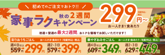 これから「あっ!と ごはん」を始める方は、週4日以上のご注文でお1人さま1食あたり299円よりご注文できる「秋の2週間家事ラクキャンペーン」をご利用いただけます。初週+翌週の最大2週間、おトクな価格でお試しいただけますので、ぜひこの機会にご利用ください。