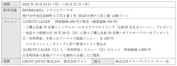 食品ロスをアップサイクルすることでフードロスの解決を目指すCRUST JAPAN株式会社(大阪市北区、代表取締役社長:Travinder Singh)協力のもと、現在店舗で販売中のサステナブルビール「CRUST LAGER」を特別価格で販売するほか、期間中にご購入いただいた先着70名様へ同社の新しいノンアルコールサステナブルドリンク「CROPあまなつハニー」をプレゼントいたします。また、水産業の課題の解決を目指す株式会社ゲイト(本社:東京都墨田区、代表取締役:五月女圭一)協力のもと、「未利用魚」と呼ばれるサイズが規格外・一般的な知名度が無く低い価格でしか評価されないといった理由で市場に出回らない魚を活用したメニューを提供します。