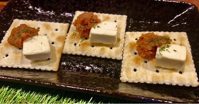 スパム味噌とクリームチーズがついお酒がすすめてしまう一品。『スパム味噌のカナッペ~クリームチーズ~』