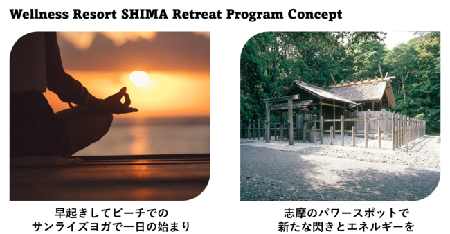 【概要】 Wellness Resort SHIMAは、地域を盛り上げたいと考える志摩エリアの様々な事業者が連携して実施する、長期滞在型の 旅行プランです。「Wellness」をテーマに、都会の喧騒から離れたリゾート地で、ココロもカラダも思い切り楽しみ・癒されることを目的としています。参加者の目的に応じて、志摩の自然に囲まれた空間で柔軟にワーク時間を確保できるワーケーションプランと、旅の全てがコーディネートされたリトリートプランの2プランを提供します。