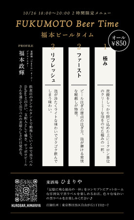 ビールを極めた2人が注ぎ分けるイベント「FUKUMOTO Beer Time (フクモトビールタイム)」を、2022年10月26日(水) 18:00-20:00の2時間限定で開催、サッポロ黒ラベルを使用した3種類の注ぎ方違いのビールをご提供いたします。