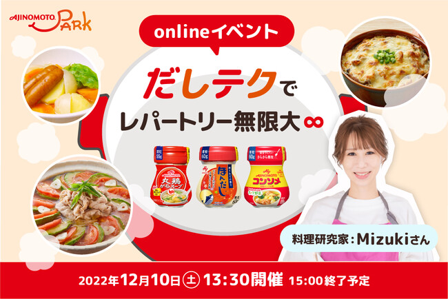 味の素株式会社(社長:藤江 太郎 本社:東京都中央区)は、当社の食の情報サイト「AJINOMOTO PARK」にて2022年12月10日(土)に開催される「『だしテク』でレパートリー無限大∞ ~料理研究家Mizukiさんと学ぶ、だしの世界~」イベントの参加者を募集しています。本イベントは、「ほんだし(R)」「丸鶏がらスープ(TM)」「味の素KKコンソメ」を使いこなすことでレシピレパートリーを増やし、料理をもっと楽しんでもらうことを目的に開催するオンラインイベントです。期間中(2022年10月21日(金)10:00~2022年10月31日(月)23:59)に、イベントの特設ページ(下記にリンク記載)よりご応募いただいた方の中から、抽選で900名様をご招待!そのうち、500名様にイベントでご紹介する製品セットをプレゼントします。