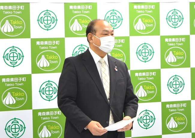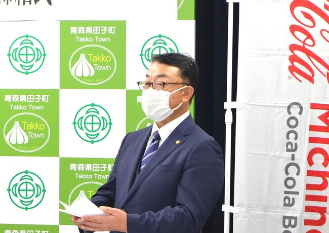 「災害時において『水の確保』は何よりも大切です。みちのくコカ・コーラボトリング様におかれましては、これまでも青森県内の多くの自治体に飲料を供給した実績があるとお聞きしており、大変心強く感じております。また、贈呈いただきましたストップマークにつきましては、当町が地域の高齢者と子どもたちを守るために制限速度30km以内に設定している『ゾーン30』エリアを中心に使用させていただきたいと考えております。このたびの包括連携協定をきっかけに、今後も様々なご協力を賜りながら、一緒に発展していければ幸いです。」
