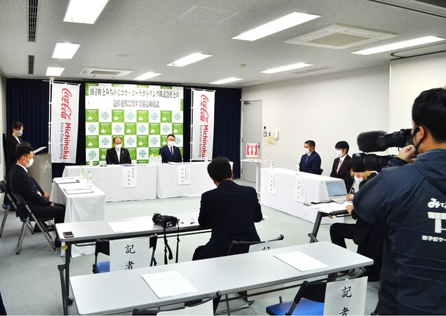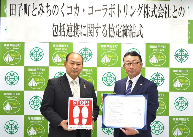このたび、みちのくコカ・コーラボトリング株式会社(本社: 岩手県盛岡市、代表取締役社長: 谷村 広和、以下「当社」)は、青森県三戸郡田子町(町長: 山本 晴美)との間で、「包括連携に関する協定」(以下「包括協定」)を締結することとし10月21日(金)に田子町「タプコピアンプラザ」において締結式を開催いたしました。