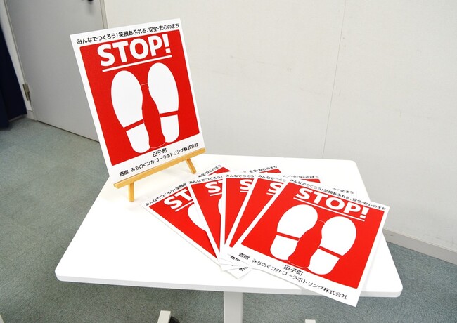 また、包括協定に基づく取り組みとして、「災害時における飲料の供給に関する協定」(以下「災害協定」)の締結および「ストップマーク」の寄贈を行いました。災害協定は、田子町における地震、風水害等の災害発生時又は発生のおそれがある場合における飲料供給に関して必要な事項を定めており、同様の協定締結は北東北では95件目、青森県では39件目となります。「ストップマーク」は、交差点等の歩道へ貼り付けることで歩行者に対し一時停止や注意喚起を促すもので、このたびは50枚を寄贈いたしました。