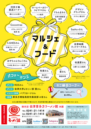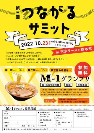 株式会社河京 会津喜多方ラーメン館本館(本社:福島県喜多方市、代表取締役:佐藤富次郎)は、河京自慢のこだわり麺3種類の試食と人気投票を行うM-1グランプリ、河京の製麺工場直送のお得な販売ブース、地元喜多方・会津で活躍するアーティストやダンスグループ、喜多方の高校生の吹奏楽部によるステージ発表、企業やクリエイターによるハンドメイド雑貨販売・フード販売、ミニ縁日などが一堂に会する「第3回つながるサミット」を2022年10月23日(日)に開催致します。
