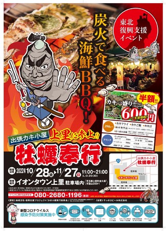 宮城県石巻の牡蠣をセルフ炭火焼き(海鮮BBQ)で楽しむ「出張カキ小屋 牡蠣(かき)奉行」(TEL 080-2680-1196)が10月28日、イオンタウン上里に期間限定オープン。期間は10/28~11/27
