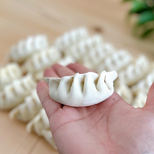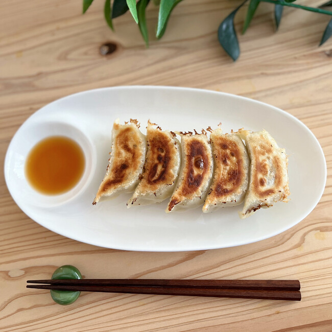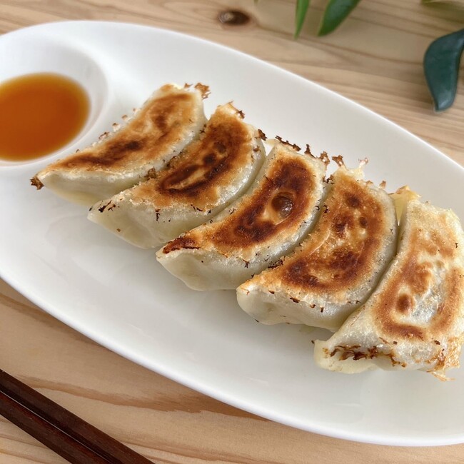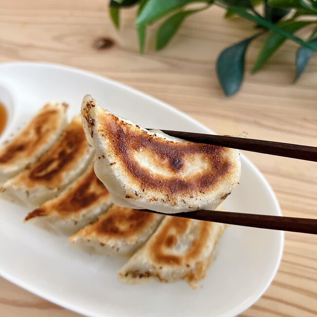 一粒20g前後で販売されている餃子が多いなか、当社の餃子は一粒34gあり一般的な餃子の約1.7倍の大きさがあります。無添加でも十分な食べ応えを感じていただきたくて、大きな餃子に仕上げました。もちもちでボリューム満点の『ぎょうざ』は、口の中でコク深い肉汁がじゅわっと広がります。