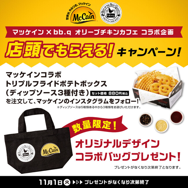 チキンのお供として定番のフライドポテト。本キャンペーンでは、マッケインの人気フライドポテト3種(クリスパーズ、スマイルポテト、ワッフルポテト)をセットにした「トリプルフライドポテトボックス(ディップソース3種付き)」(税込880円)を国内全店舗で提供。店内での飲食のほか、テイクアウトにも対応するので、秋の行楽や家でのパーティ、スポーツ観戦などにもぴったりなセットです。このフライドポテトボックスをご注文のうえ、マッケインのInstagramをフォローいただいた方に「オリジナルデザイン コラボバッグ」をプレゼントします(数量限定のため無くなり次第終了)。