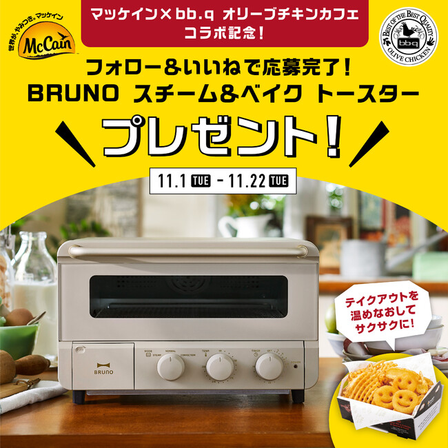 さらにマッケインのInstagramにおいても、「フォロー&いいね プレゼントキャンペーン」を実施。抽選で1名様に、チキンやフライドポテトの温めなおしに活躍する「BRUNOスチーム&ベイク トースター」をプレゼントします。