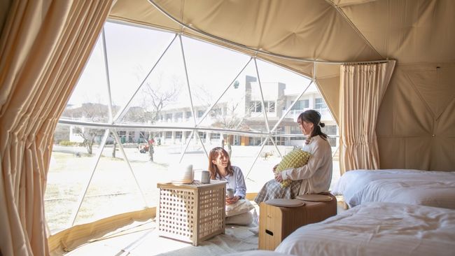 小学校リノベーション施設×グラピングのコラボレーションで、温かみのあるアウトドア空間の「glampark アクアクレタ小石原」。