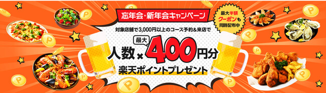 本キャンペーンでは、対象の飲食店でランチ1,500円以上、ディナー3000円以上のコースを2名以上でネット予約・来店すると、ランチは人数×最大140ポイント(プレミアム会員でアプリ予約した場合は最大180ポイント)、ディナーは人数×最大400ポイント(※1)の「楽天ポイント」が進呈されます。さらに、コース予約で会計金額から最大6,000円OFFになるネット予約クーポンを発行。ポイントを獲得しながらお得に忘年会・新年会を楽しむことができます。