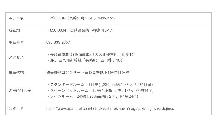 現在、長崎県ではアパホテル〈長崎駅前〉(全85室)、アパホテル〈長崎駅南〉※(全101室)を運営しており、当ホテルの開業で長崎県内のアパホテルは3棟336室となる。※一棟貸し中