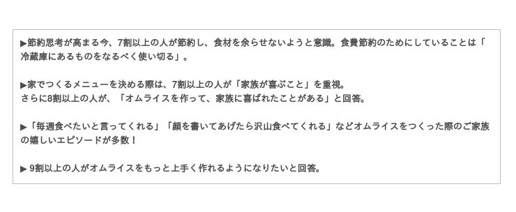 当社が今年9月に実施した「お家ごはんの意識調査」では、7割以上の人が食費の節約を意識しており、同じく7割以上の人が家でつくるメニューを決める際に「家族が喜ぶこと」を重視していると回答しています。また、8割以上の人が「オムライスを作って家族に喜ばれたことがある」と回答しました。冷蔵庫にありがちな野菜や卵などの食材で気軽につくれて、それでいて家族が喜ぶオムライスは、今の食卓の心強い味方になることが期待できます。