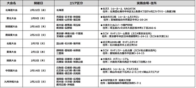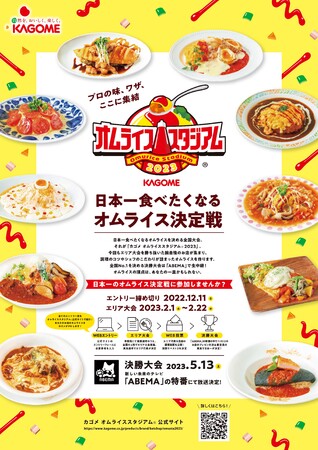 「カゴメ オムライススタジアム2023」公式サイト:https://www.kagome.co.jp/products/brand/ketchup/omusta2023/日本生まれの洋食“オムライス”は長年幅広い世代から愛されてきた国民的メニューです。2015 年に開催して以来、3度目となる今回は、書類選考、エリア大会を実施して、各エリアの代表9店舗を決定し、その後、WEB投票を活用し決勝大会に進む上位3店舗を選出。決勝大会は、2023年5月13日(土)に新しい未来のテレビ「ABEMA」にて配信される特別番組内で行います。
