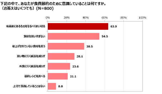 ??節約思考が高まる今、7割以上の人が節約し、食材を余らせないようと意識。食費節約のためにしていることは「冷蔵庫にあるものをなるべく使い切る」。