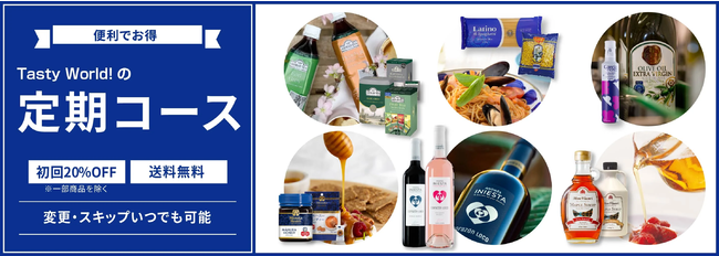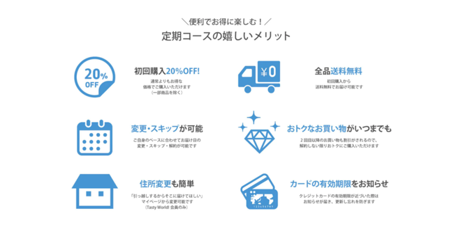 今回新たに定期コースを開始しました。定期コースでは、便利に、お得にTasty world!お取り扱い商品をお楽しみいただけます。