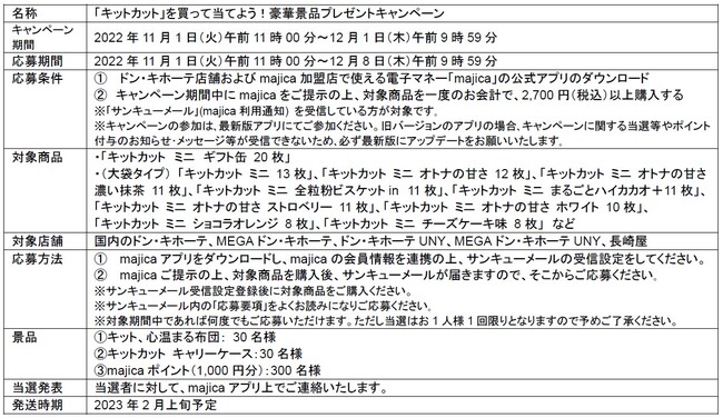 「キットカット ミニ ギフト缶」の新発売に合わせて、全国の「ドン・キホーテ」店舗で対象商品を購入すると、豪華景品を抽選でプレゼントするキャンペーンを実施します。