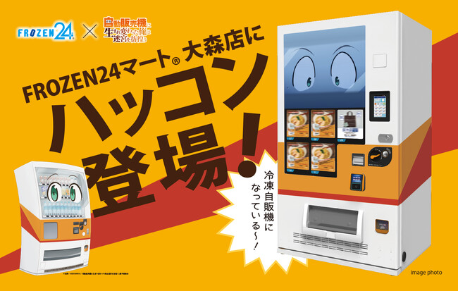 JR大森駅前の冷凍グルメ自販機ショップ「FROZEN24マート大森店」には、アニメの主人公「ハッコン」のラッピングをした冷凍自動販売機を設置、さらに店舗ラッピングではハッコン以外のキャラクターも登場し、より作品の世界感をお楽しみいただけます。期間中に表情が変化していく、ここでしか会えないハッコンにもご注目ください。