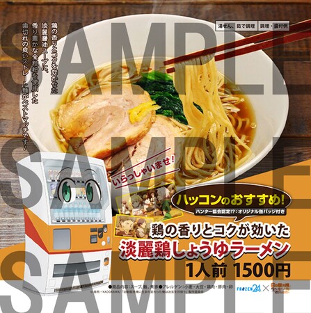 また、ハッコンからキャラクター缶バッジ付きのコラボ商品「ハッコンのおすすめ!鶏の香りとコクが効いた淡麗鶏しょうゆラーメン」をご購入いただけます。8月には都内4か所の「FROZEN24マート」でもコラボ商品が登場いたします。