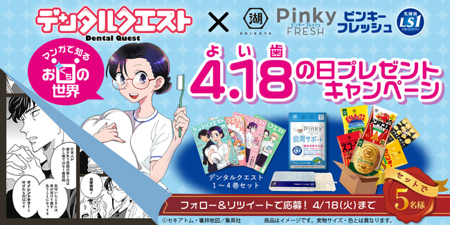 株式会社湖池屋(本社:板橋区/社長:佐藤章)は、2023年4月18日の“よい歯の日”を機に、お口の乳酸菌LS1を含有した“健康な歯ぐきを維持する”機能性表示食品「Pinky FRESH(ピンキーフレッシュ)」をより多くの方に知っていただき、口内ケアから始める健康の増進を図りたいとの思いから、口内ケア・予防歯科をテーマにした、アプリ ヤンジャン!、となりのヤングジャンプで連載中の話題のマンガ「デンタルクエスト」とのコラボキャンペーンを実施します。