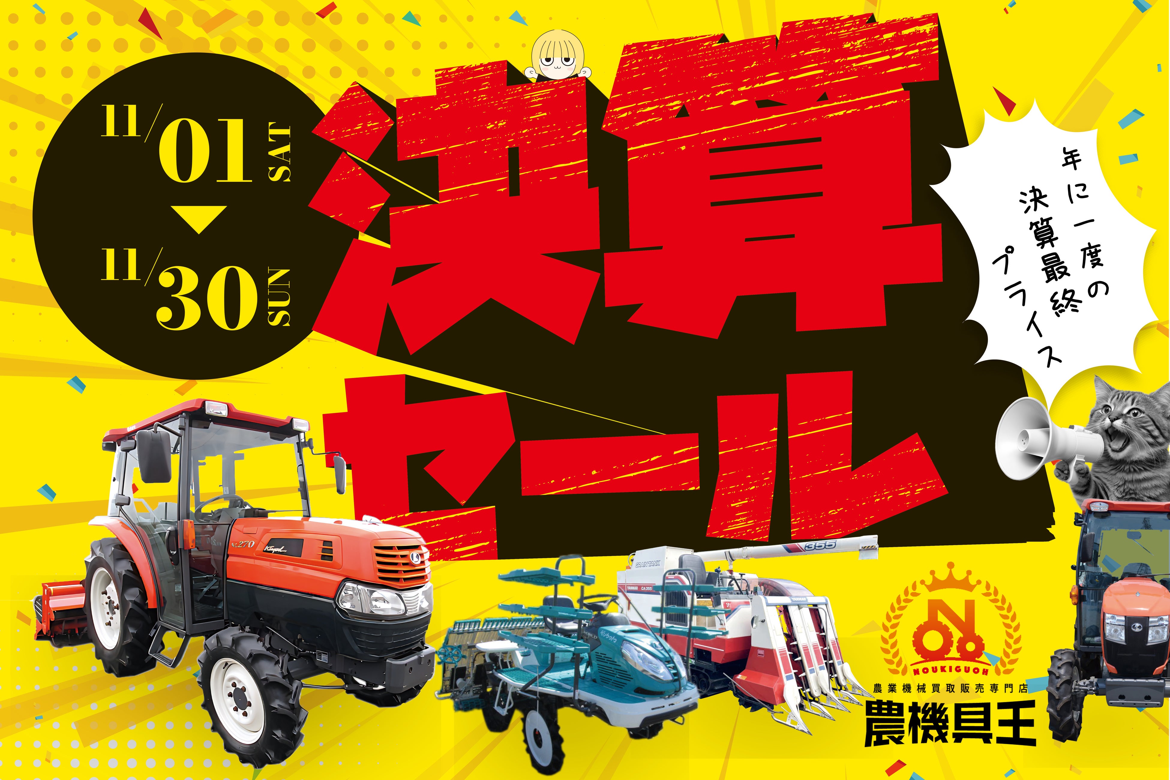 2025年11月1日(土)~11月30日(日)の1か月間、全国30店舗の「農機具王」全店およびネット販売にて、全店同時「決算セール」を開催いたします。今年は、北海道と鳥取県に新たに店舗がオープンし、全国展開の節目を迎えました。これを記念して、感謝の気持ちを込めた特別なセールを実施します。
