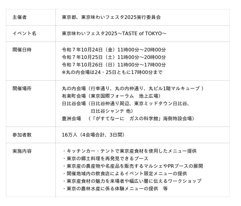 東京産食材を使った料理を味わい、体験することで「農」や「食」の多彩な魅力を発見するイベント「東京味わいフェスタ2025~TASTE of TOKYO~」を10月24日(金)から26日(日)に丸の内・有楽町・日比谷・豊洲の4会場で開催しました。農・林・水産業の魅力を体感できるキッチンカーやワークショップに加え、今年度は東京の郷土料理を再発見できるブースを設置。期間中はあいにくの天候にもかかわらず、多くのお客様にご来場いただきました。