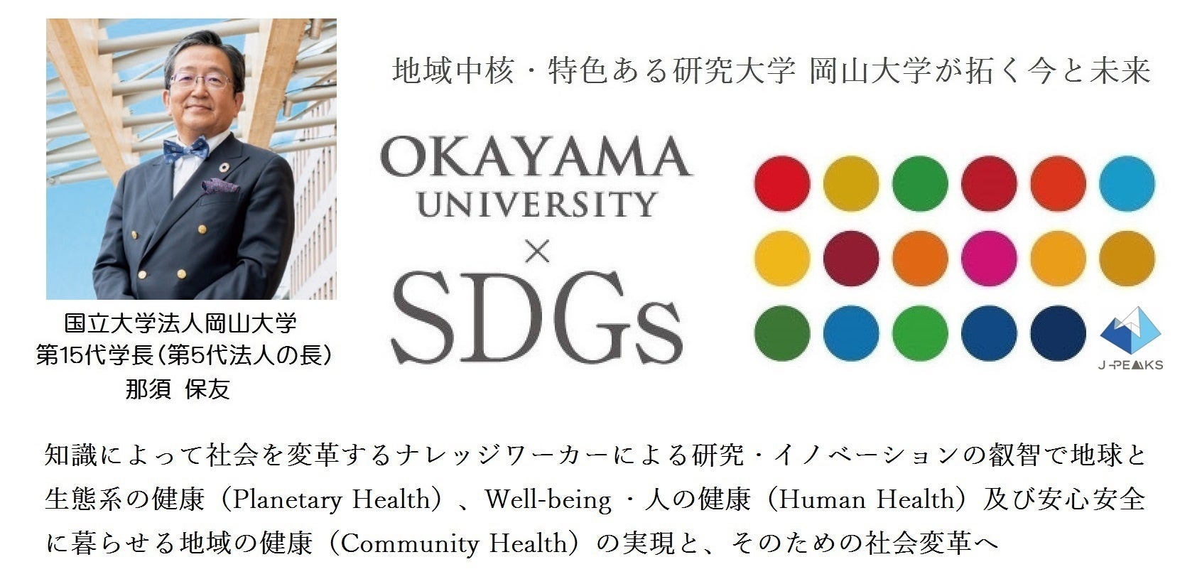 - 岡山大学 文部科学省「地域中核・特色ある研究大学強化促進事業(J-PEAKS)」に採択~地域と地球の未来を共創し、世界の革新の中核となる研究大学:岡山大学の実現を加速とともに世界に誇れる我が国の研究大学の山脈を築く~