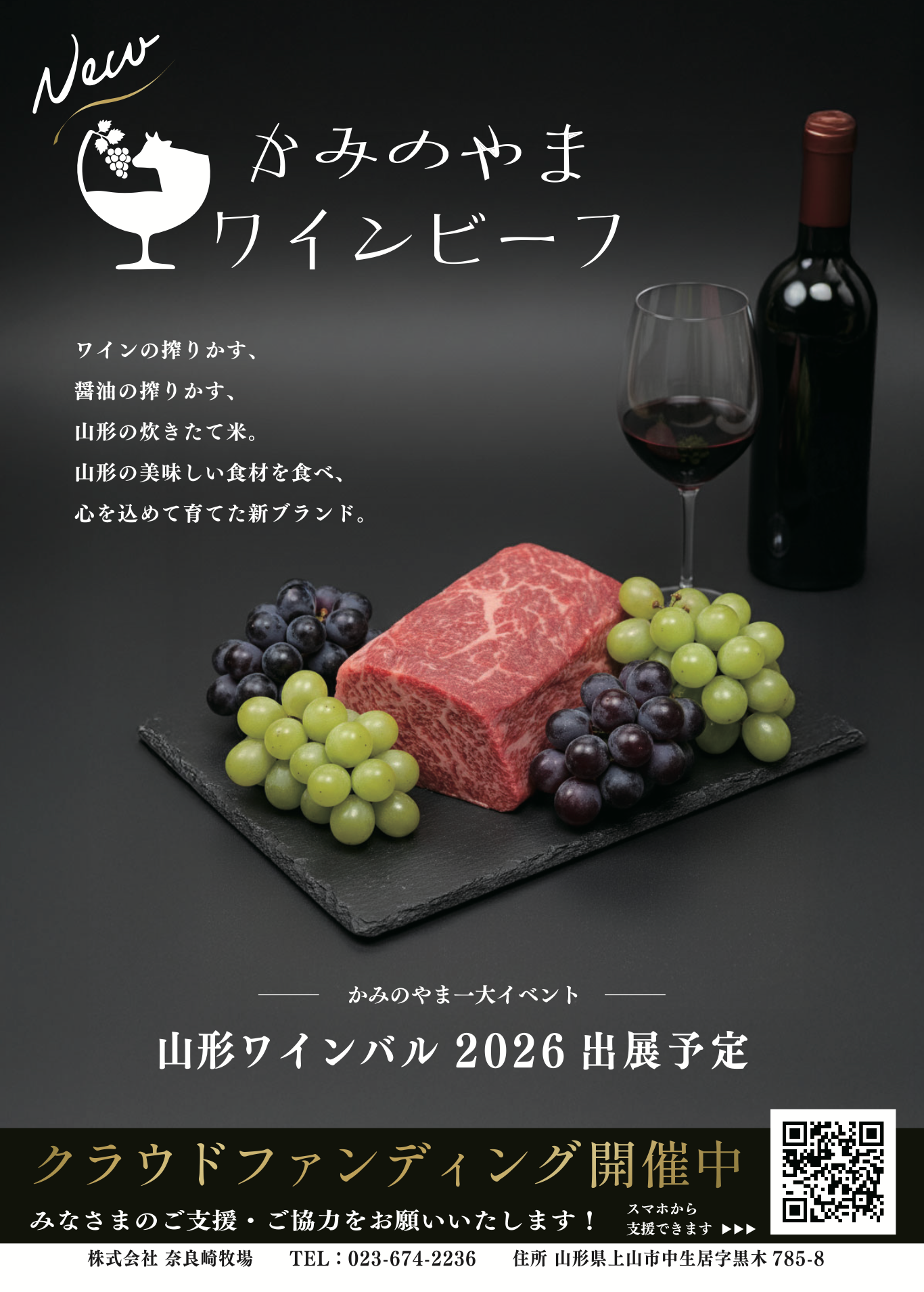 [株式会社奈良崎牧場](本社:[山形県上山市中生居字黒木785-8]、代表取締役:[奈良崎進])は、[かみのやまワインビーフ]を新たに立ち上げ、クラウドファンディングによる資金調達を開始します。このプロジェクトは、[2025年12月25日]まで開催され、[For Good(フォーグッド)](URL:[https://for-good.net/project/1002409])にて実施されます。