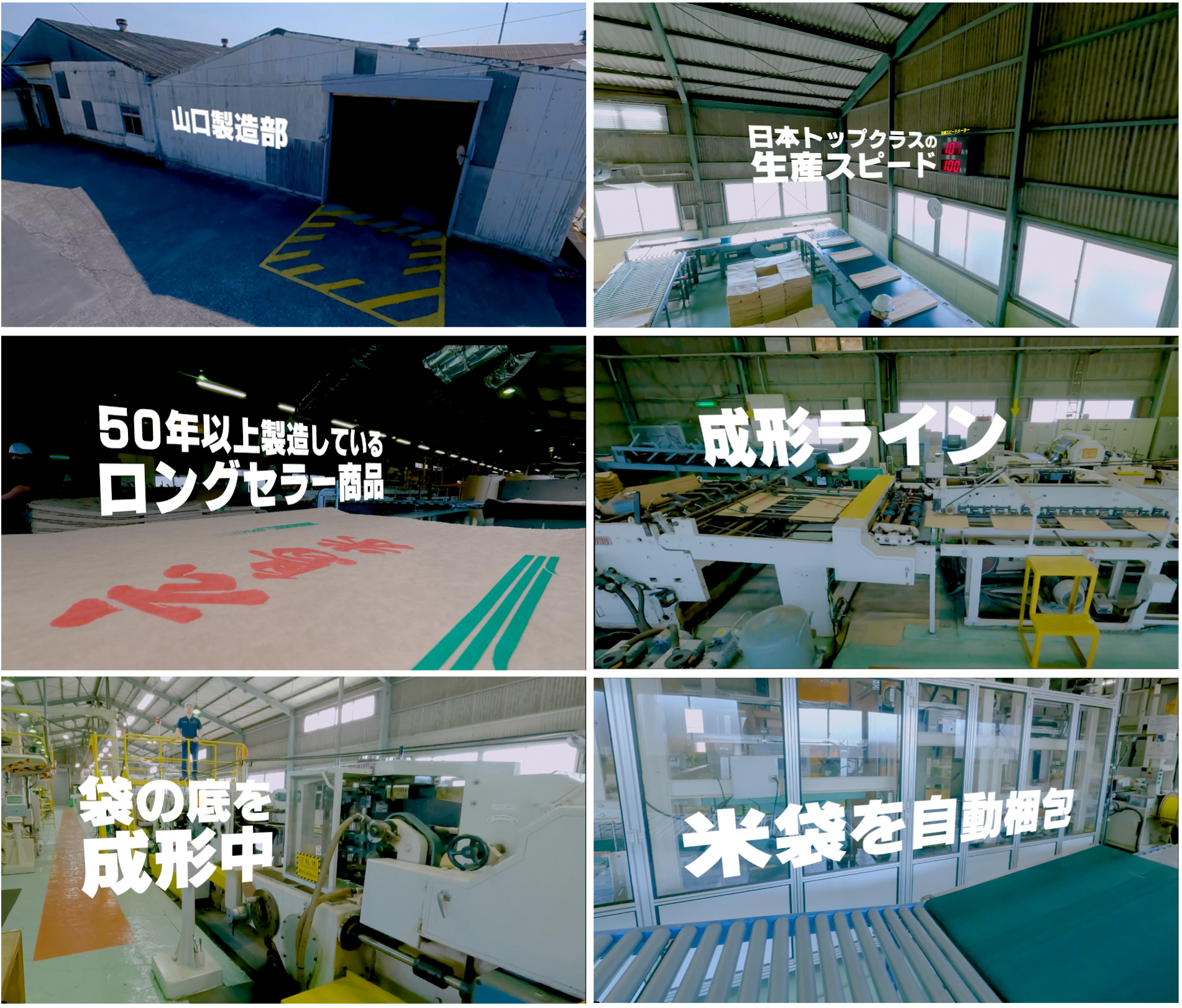 2023年に公開した福島新工場のドローン映像に多くの反響を頂きました。その中で「流通を支えている紙袋がどのように生産されるかを知れてよかった」という感想が印象的でした。今回の省人化ラインの完成を記念して山口の米袋製造ラインもドローン撮影をして公開することに致しました。今回のプロモーション映像はドローン撮影、音楽、動画編集と山口工場のある岩国市近郊の広島出身の方々のご協力で完成しました。「包むことで食卓を支える」我々の製品がどのように製造されているのかを映像を楽しみながら知っていただければ幸いでございます。