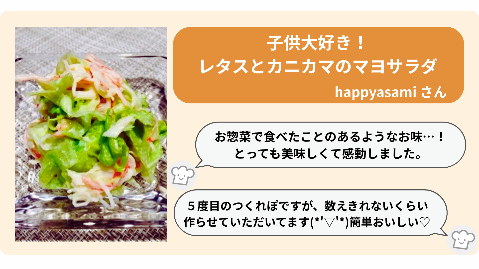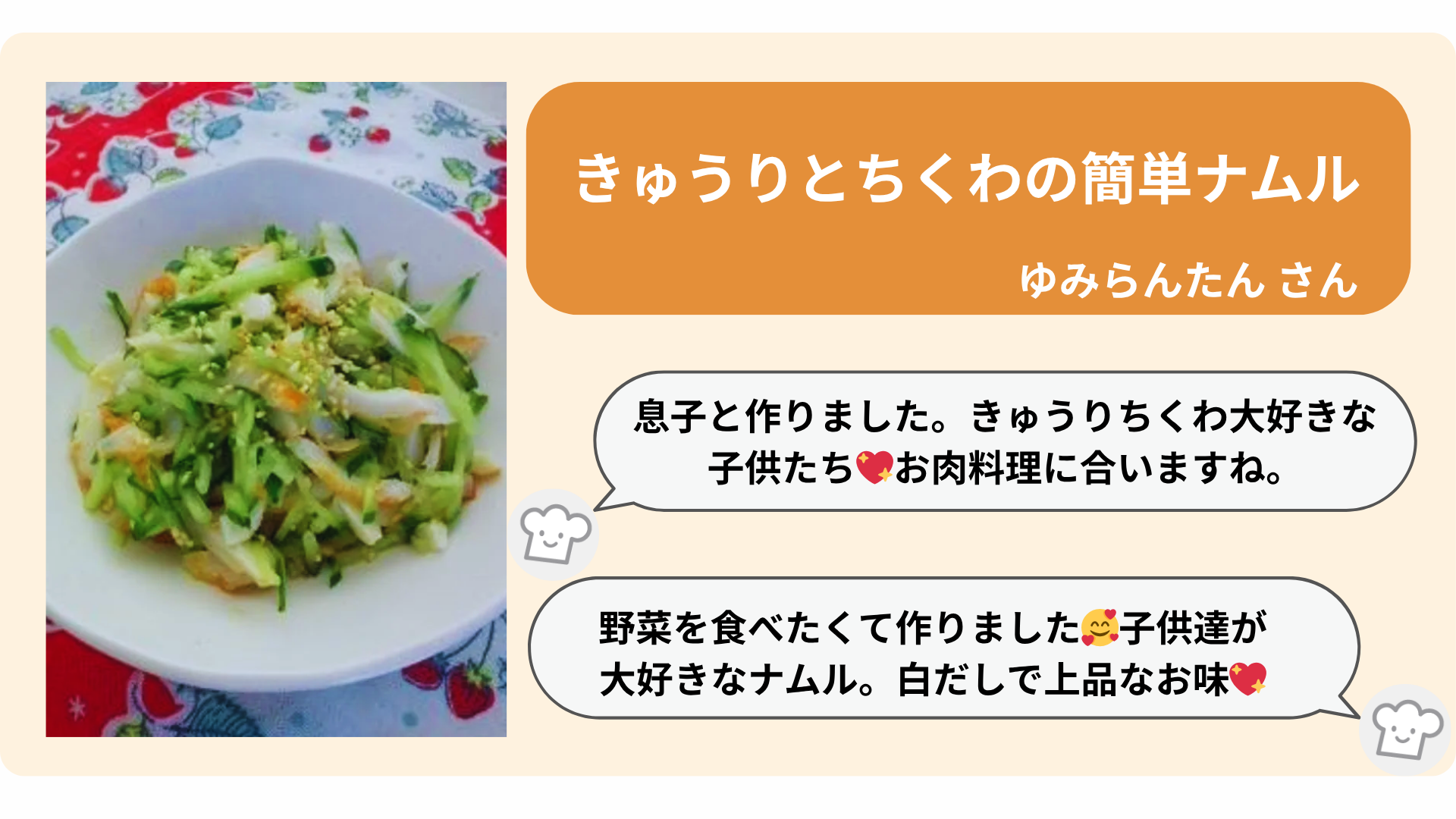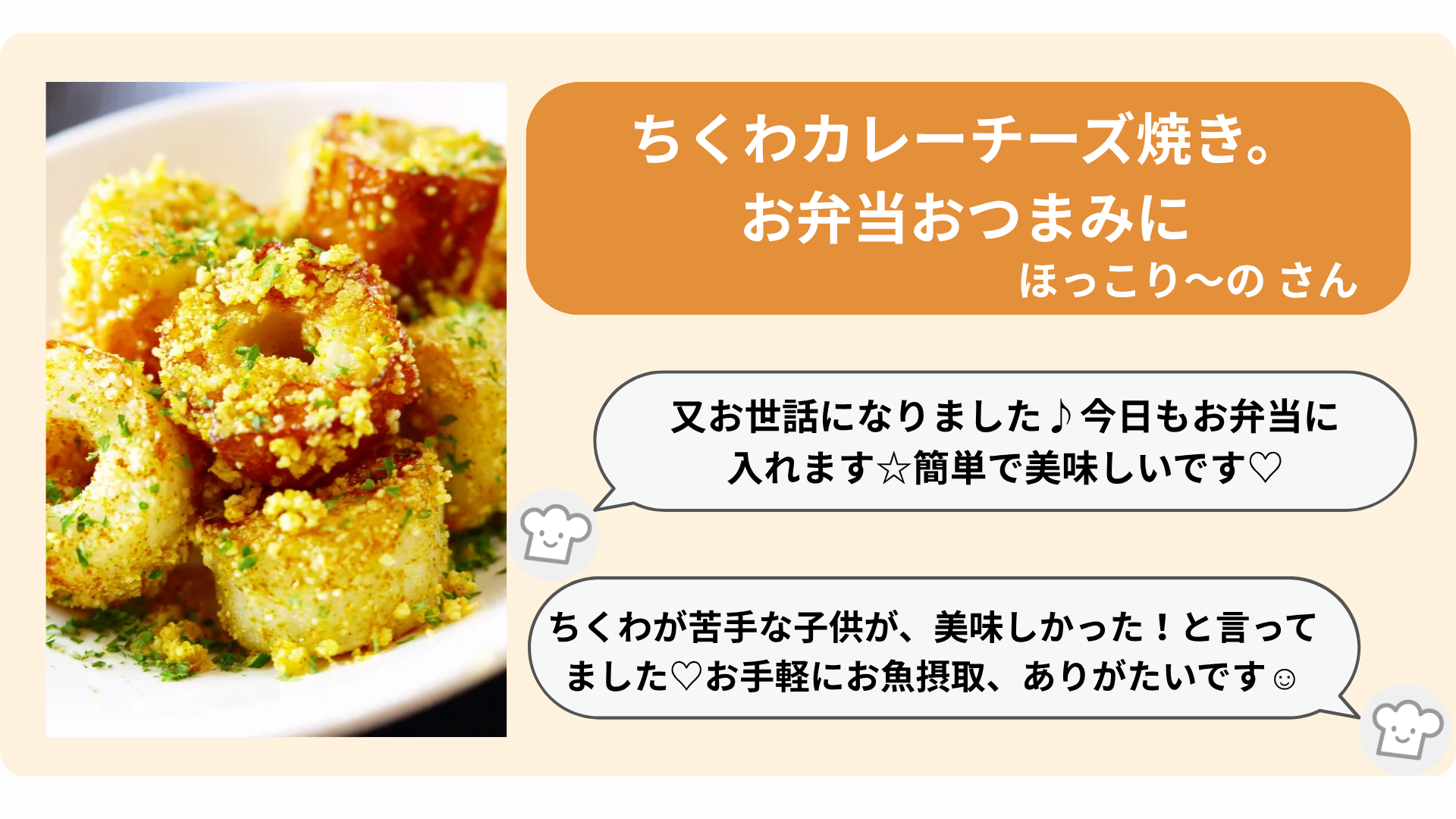 実際、クックパッドに投稿されたレシピへの「つくれぽ(作りましたフォトレポート)」を分析すると、ユーザーの柔軟な活用ぶりが浮き彫りになります。「お弁当の隙間に」「あと1品がササッと作れて助かる」といった時短ニーズに加え、「ピーマン追加で」「カレー味にアレンジ」「カニカマの代わりにちくわで」など、手持ちの食材に合わせた工夫が多数報告されています。「リピです」「定番になりました」という声も目立ち、一時的なブームではなく日々の食卓に定着していることがうかがえます。