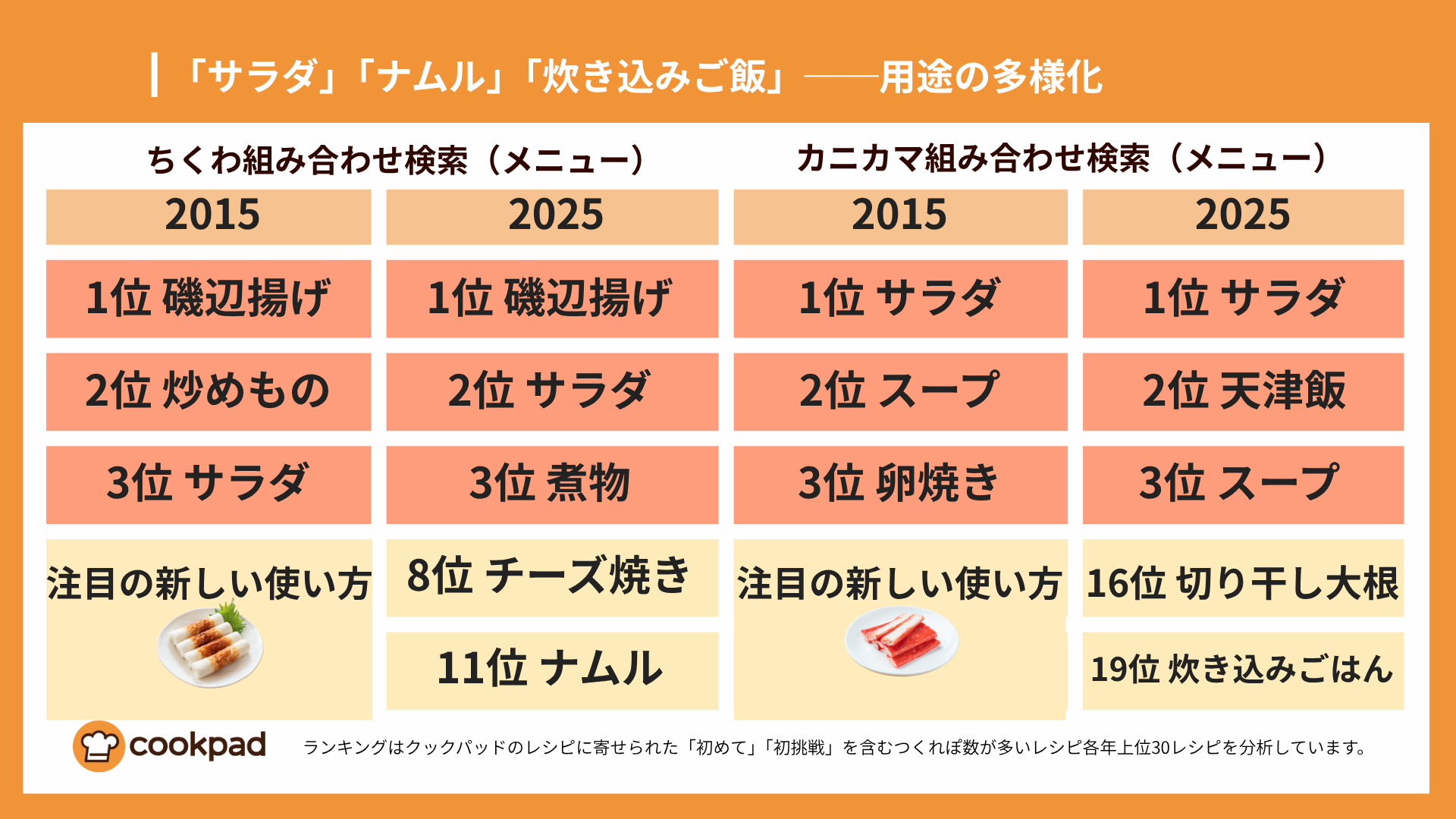 価格の手頃さだけでなく、使い方の広がりも検索増加の背景にあります。ちくわの組み合わせメニュー検索では「磯辺揚げ」が1位を維持しつつ、「サラダ」が2022年に2位に浮上し、「ナムル」が2025年に11位で初登場しました。カニカマも「サラダ」が定番の1位を維持する一方、2025年には「炊き込みご飯」が19位に初ランクインしています。(※1)。