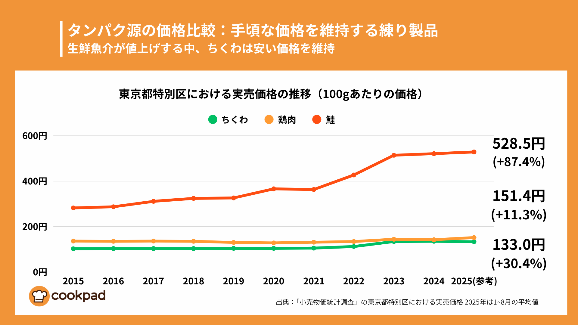 利用者数No.1レシピサービス「クックパッド」を運営するクックパッド株式会社は、魚肉練り製品の検索動向を調査しました。調査の結果、物価高が続く中、手頃で使いやすいタンパク源として「ちくわ」と「カニカマ」の検索が2015年比で約1.8倍に増加していることが明らかになりました(※1)。さけは282円(2015年)から521円(2024年)へと約85%上昇し、2025年1-8月平均でも529円と高値が続いています。一方、ちくわは102円(2015年)から133円(2025年1-8月平均)へと推移。手頃なタンパク源として再評価されています。食品需給研究センターの調査では2025年1~8月の練り製品生産量が前年同期比13.1%増となっており、家庭での利用拡大が市場全体の伸びにも表れています(※2)。