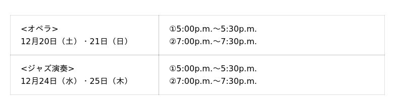 幻想的な雰囲気と華やかさに包まれたホテルメトロポリタンのロビーで、クリスマスならではのオペラやトリオが奏でる優雅な演奏の音色をお楽しみください。