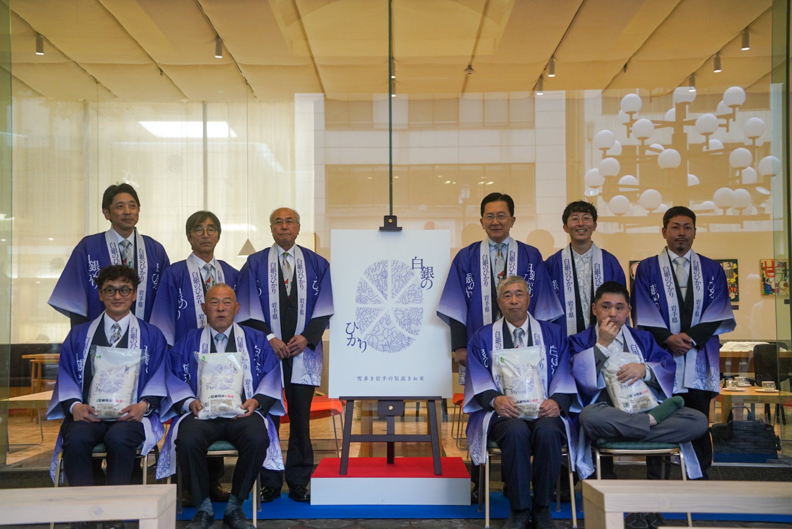 (後列左から)JA全農いわて 佐竹副本部長、同 高橋本部長、同 苅谷副会長、達増知事、ヘラルボニー 松田代表、白銀のひかり栽培研究会 大崎副会長(前列左から)白銀のひかり栽培研究会 古川副会長、同 今松副会長、同 新井野会長、小林 覚さん