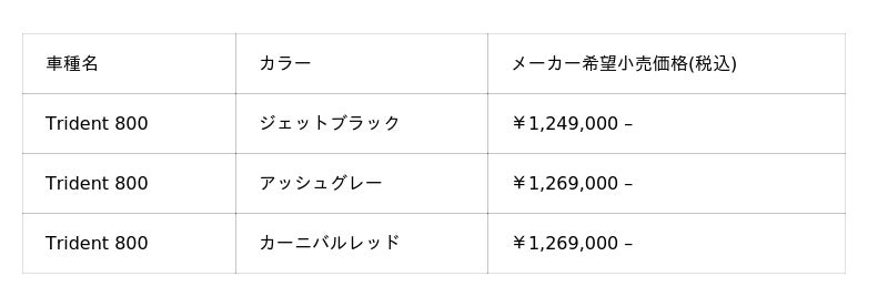 新型「Trident 800」の価格は¥1,249,000から、トライアンフのディーラーにて注文可能です。店頭での納車は2026年2月末を予定しています。