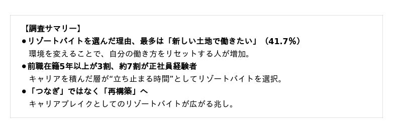 仕事を一度離れ、自分自身と向き合う「キャリアブレイク」としてリゾートバイトを活用する人が増加傾向にあり、働く価値観の変化が広がりつつあることがわかりました。