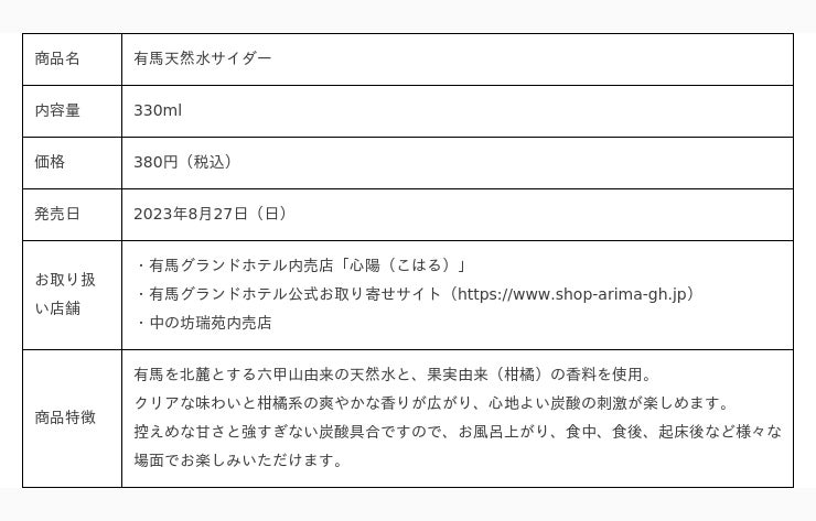 株式会社中の坊(神戸市北区有馬町808 代表取締役 梶木 実)は、2023年8月27日(日)に当館オリジナルサイダー「有馬天然水サイダー」の販売を開始いたします。六甲山の天然水と果実由来香料にこだわったサイダーで、お食事前や湯上がりのひとときに、クリアな味わいと柑橘系の爽やかな香り、そして心地よい炭酸の刺激をお楽しみいただけます。有馬グランドホテル内売店「心陽(こはる)」および「有馬グランドホテル公式お取り寄せサイト」、中の坊瑞苑内売店にてお買い求めいただけます。