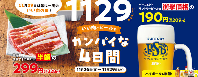 ワタミ株式会社(本社:東京都大田区、以下ワタミ)は全国で展開する、高品質な焼肉をリーズナブルな価格で提供する「焼肉の和民」は、年に一度の「いい肉の日」となります11月29日を含む、2023年11月26日(日)から11月29日(水)までの4日間、「黒毛和牛焼きすきカルビ」を通常価格の半額となる1皿299円(税込328円) 、「パーフェクトサントリービール」は1杯190円(税込209円)で販売いたします。