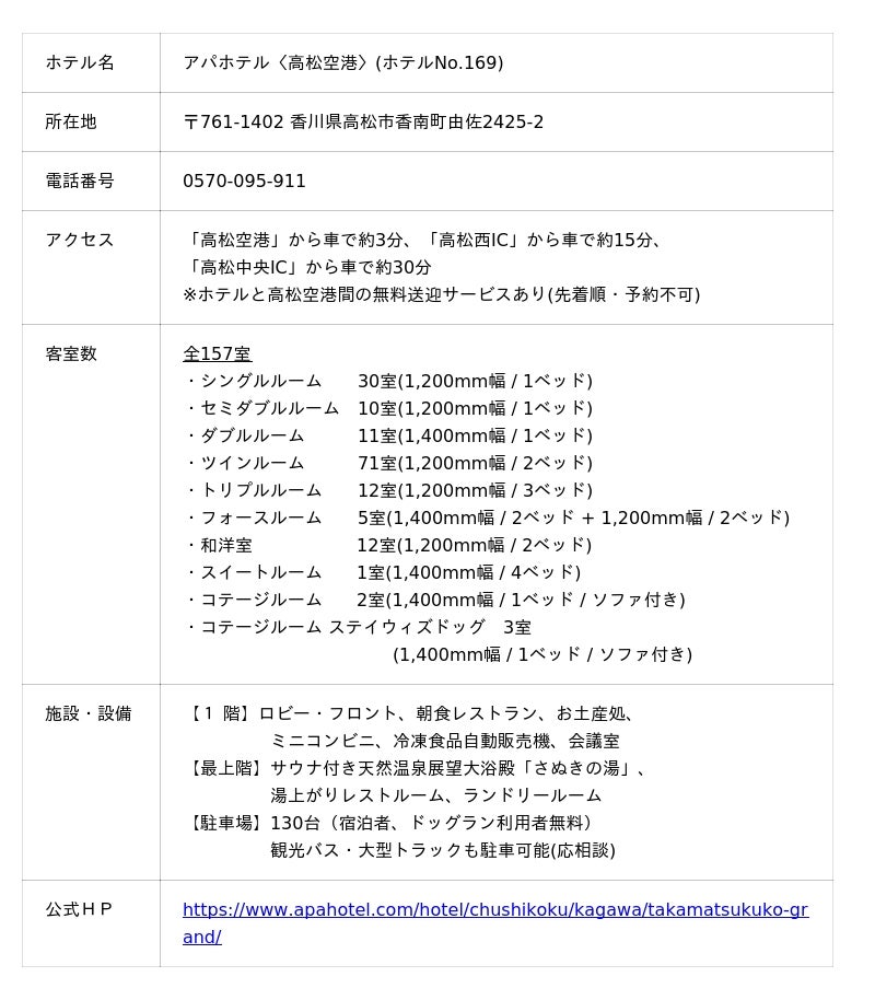 アパホテル〈高松空港〉公式HP:https://www.apahotel.com/hotel/chushikoku/kagawa/takamatsukuko-grand/