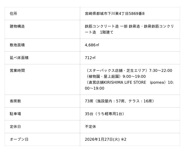 霧島酒造株式会社[本社:宮崎県都城市、代表取締役社長:江夏邦威]は、現在建設中のスターバックス コーヒー ジャパン 株式会社とのコラボレーションプロジェクトから誕生した施設の名称を「KIRISHIMA GREENSHIP icoia (キリシマ グリーンシップ イコイア)」に決定し、2026年1月27日(火)にオープンいたします。また同施設内に開業する直営店舗は「KIRISHIMA LIFE STORE ipomea (キリシマ ライフ ストア イポメア)」とし、「霧島酒造が提案する暮らしをアップデートしてくれるアイテムが集まる場所」として、食品や酒器、雑貨などを中心に販売します。