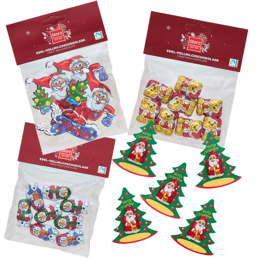 PLAZAが直輸入しているドイツのチョコレートブランド「ストルツ」。サンタクロースデザインや、雪だるまデザインなど、ユニークでキュートなチョコレートはプチギフトにもおすすめ。【PLAZA限定】ストルツ チョコレートバッグ 各種 各496円(税込)