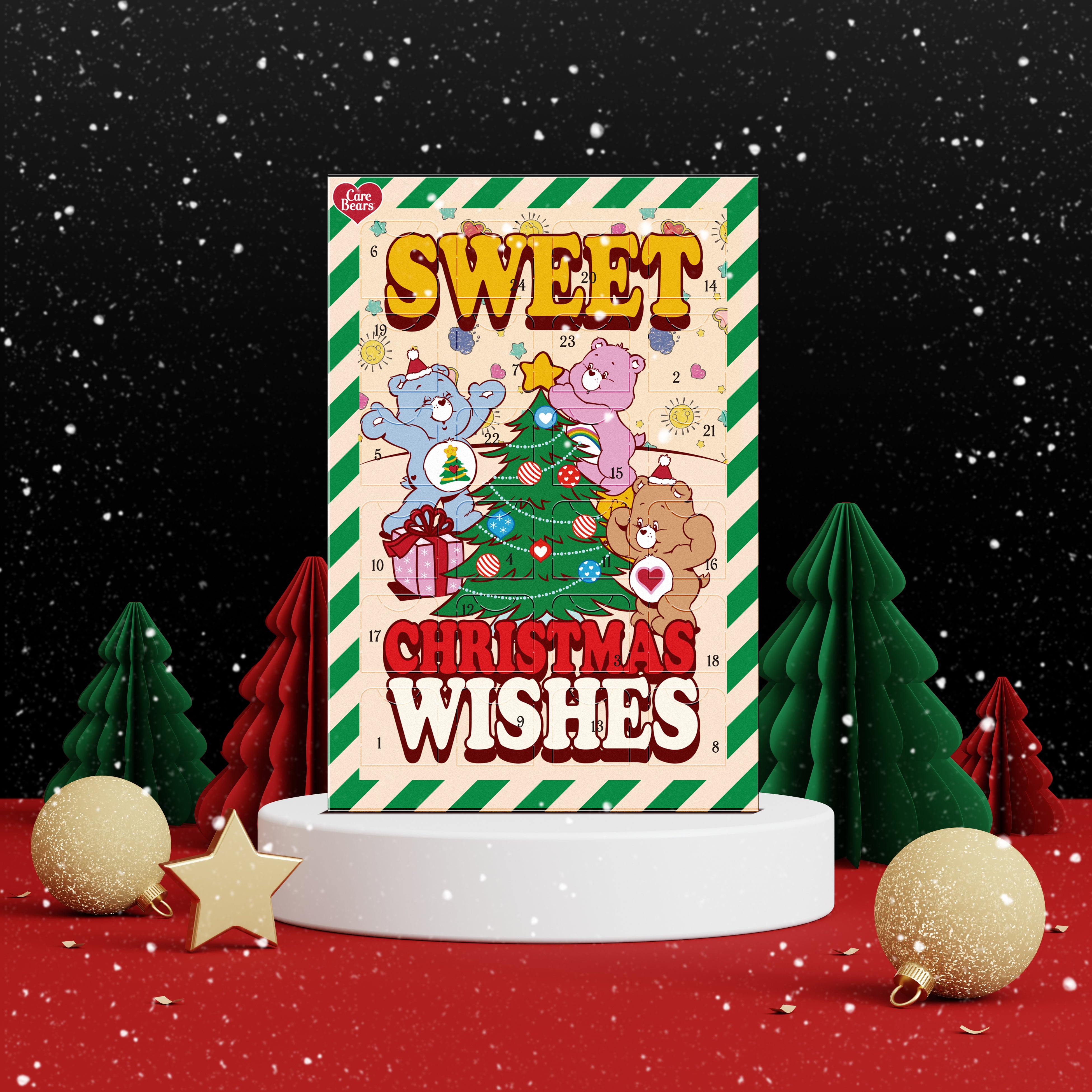 レトロ感のあるクリスマスデザインがキュートなアドベントカレンダー。様々な形のチョコレートの中に、ケアベアのフェイス型チョコレートも入っている日があるかも…! 【PLAZA限定】ケアベア アドベントカレンダー 696円(税込)