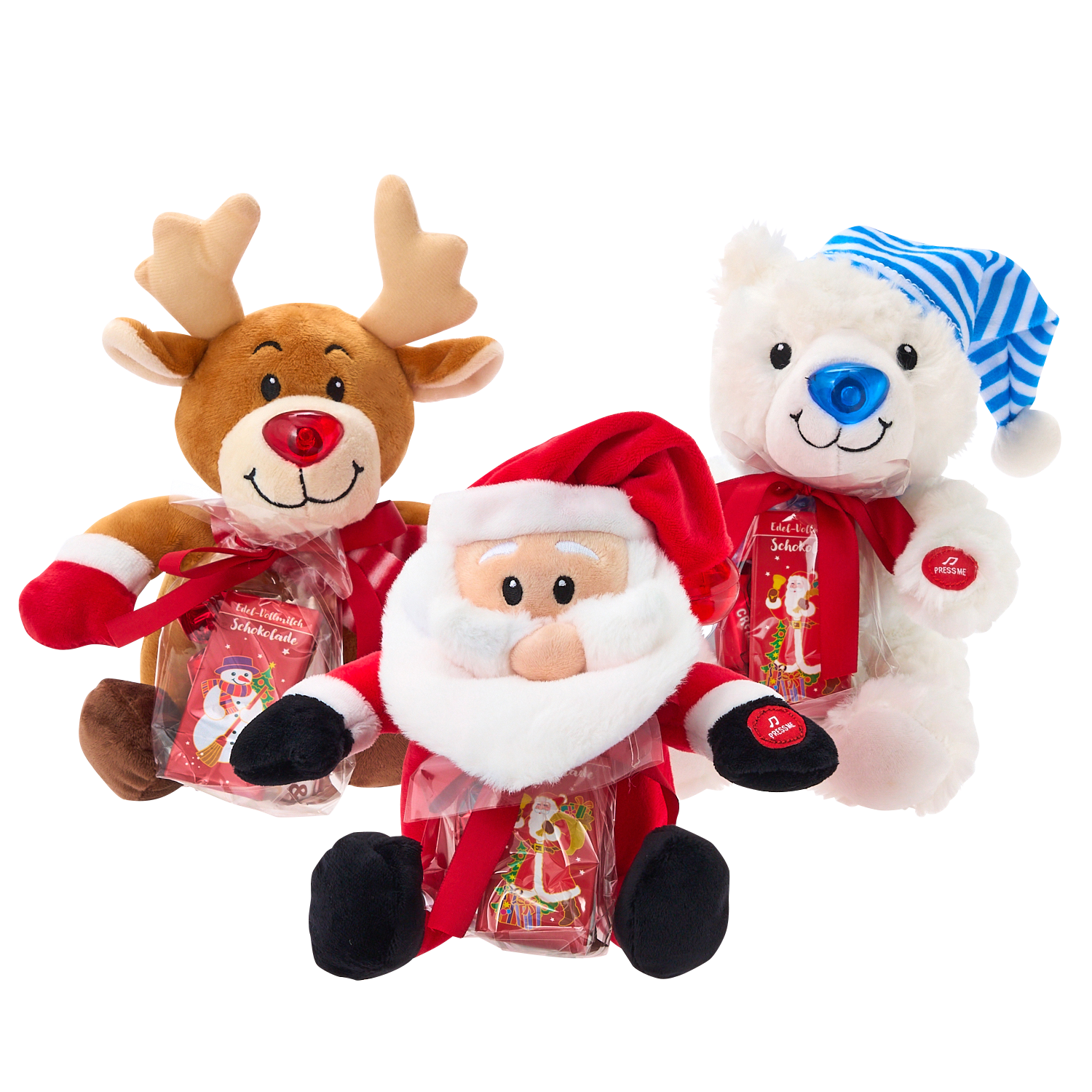 スイッチを押すと、鼻や帽子の先を光らせながら、楽しい音楽を奏でるぬいぐるみトイ。チョコレートがセットになっています。 WINDEL クリスマス シング/ライトプラッシュ 全3種 各2,970円(税込)