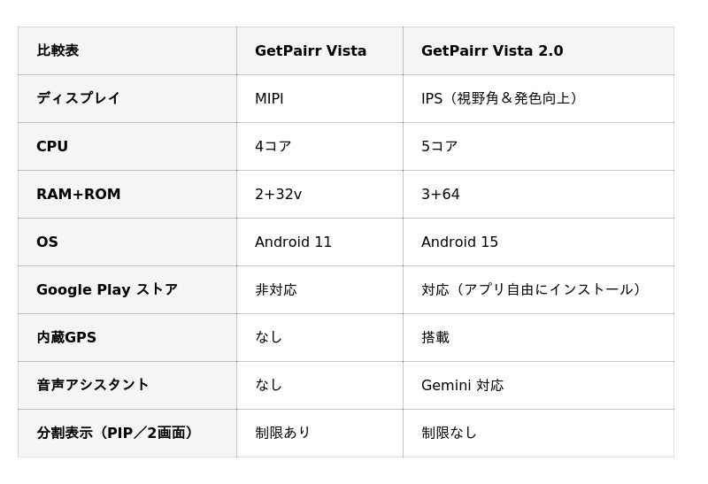 従来モデル「GetPairr Vista」では制限のあったアプリ拡張性を完全に改善。新型「Vista 2.0」はAndroid 15+5コアCPUによる処理性能向上により、動画アプリや地図アプリを同時に開いてもストレスなく快適に動作します。起動速度は約1.5倍、マルチタスク性能も飛躍的に向上。まさに「さくさく動く」を体感できる新世代ディスプレイです。
