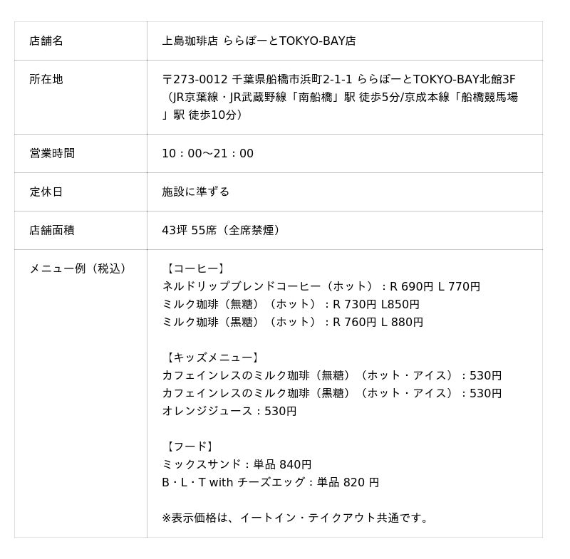 上島珈琲店は、ネルドリップならではの深い味わいと、心を込めた一杯・一皿を通じて、お客様に「上質なひととき」をお届けしてまいります。ぜひ、『上島珈琲店 ららぽーとTOKYO-BAY店』で、コーヒーを通して自分らしく過ごせるひとときをお楽しみください。