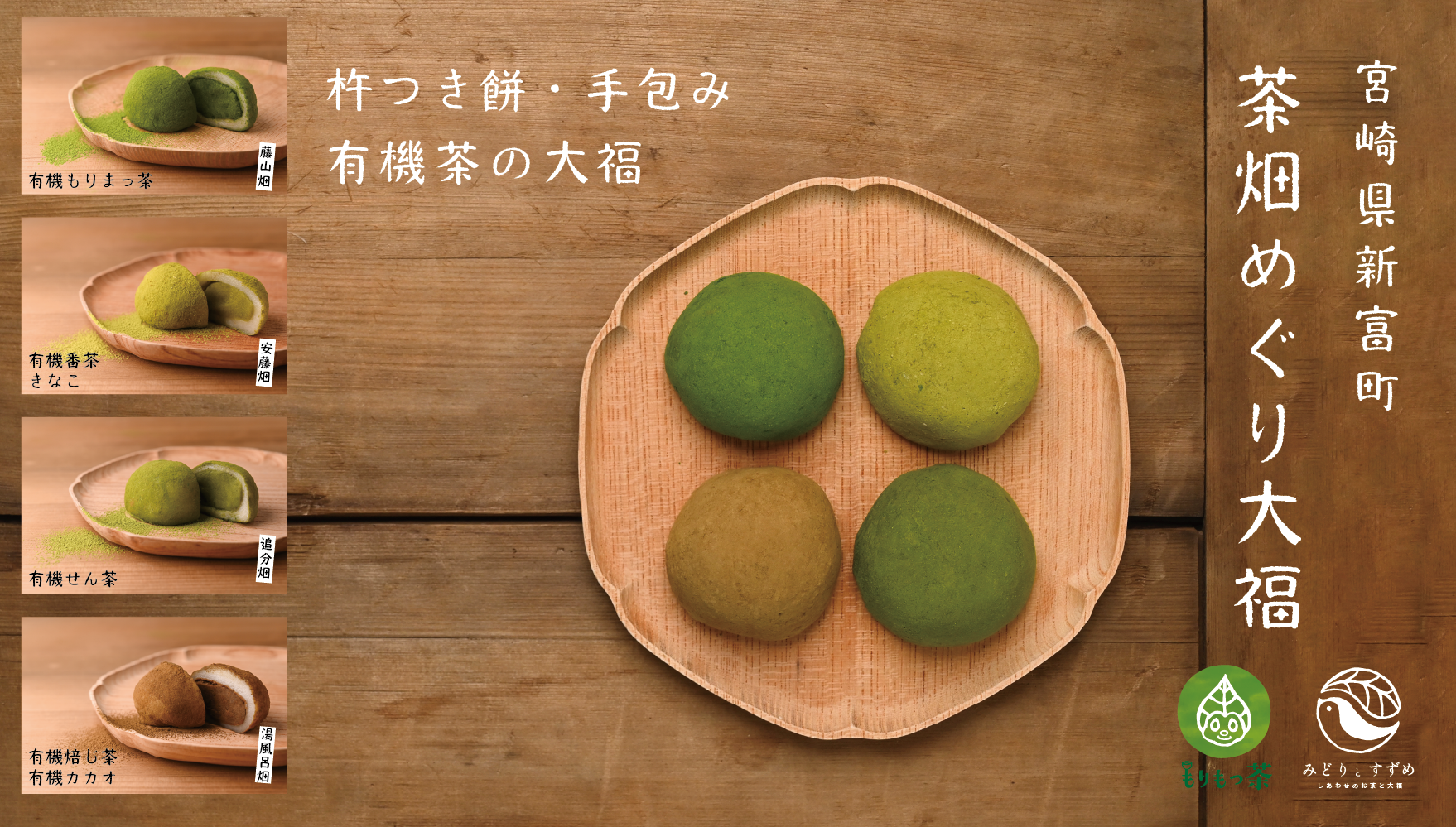 自社店舗「みどりとすずめ」で有機茶をたっぶり使った餡を杵つきのお餅で手包みし、有機茶パウダーをたっぷりまぶした大福。できたてを急速冷凍しています。地方発送も承ります。