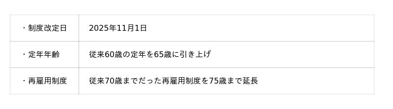 近年の経済環境では、円安や物価上昇が続く中で、高齢者にとっては年金の実質減少と生活費の増加という厳しい状況が予測されています。定年を延長することは、社員の生活の安定と安心につながる重要な施策であると考えております。また、社会全体の高齢化が進む中で、まだ若く元気なシニア社員の活躍を促進するとともに、経験豊富な社員の知識や技術を次世代に継承する仕組みづくりも推進してまいります。