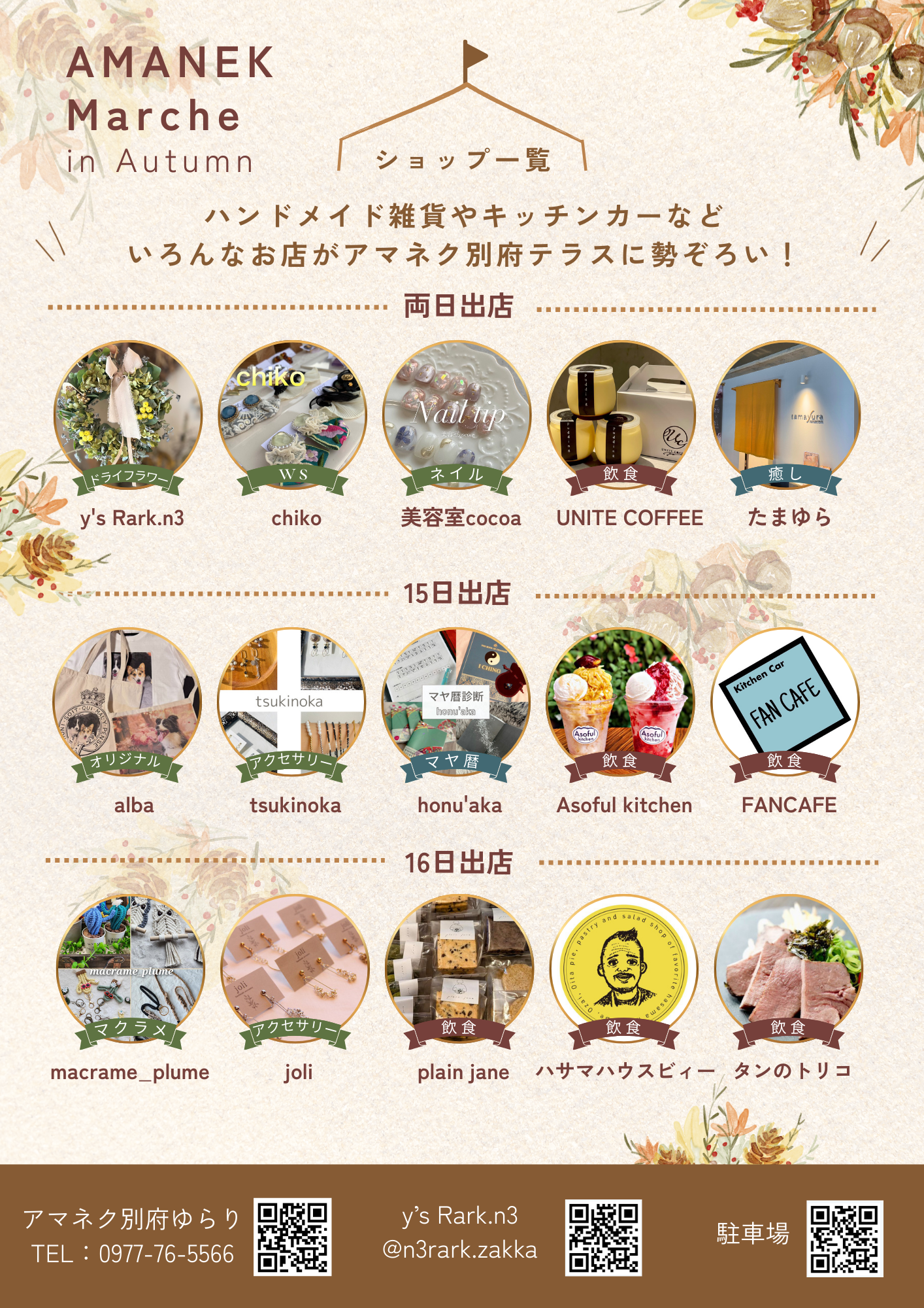 地域活性化ホテルとして、街とつながる取り組みを積極的に行うアマネク別府ゆらりでは、今年もホテル敷地内にて「アマネクマルシェ in Autumn」を開催します。大分県を中心に九州で活動するハンドメイド作家や、地元で話題のキッチンカー・カフェなど、個性豊かなお店が集まる2日間です。